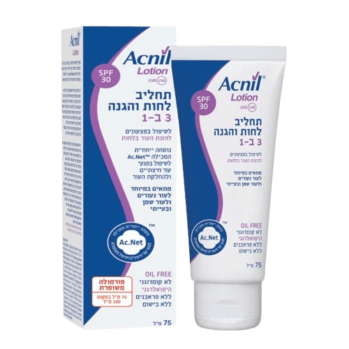 תחליב לחות והגנה 3 ב-1 30 SPF לטיפול בפצעונים מכיל 75 מ"ל מבית אקניל - ACNIL
