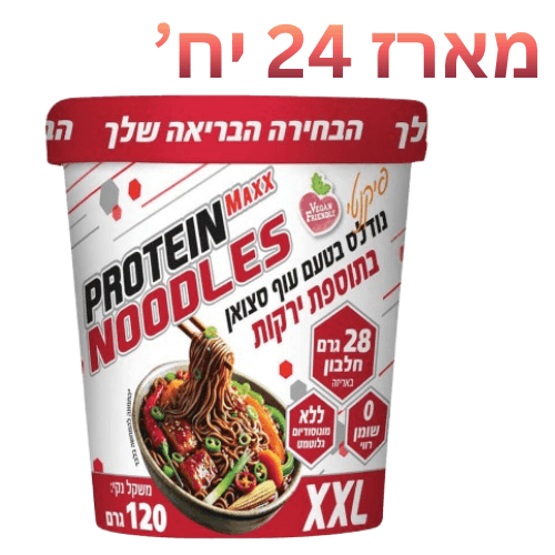 נודלס PROTEIN MAXX בטעם עוף סצואן בתוספת ירקות הוא פתרון מושלם לארוחה מהירה, משביעה ומזינה. המנה מכילה 28 גרם חלבון, עשויה מאטריות מלאות, מועשרת בירקות מיובשים, טבעונית, ללא מונוסודיום גלוטמט ועם 0% שומן רווי. מגיעה באריזת XXL ומעניקה שילוב מנצח של טעם עשיר וערכים תזונתיים גבוהים — אידיאלי לספורטאים, עסוקים ולכל מי שמחפש ארוחה טעימה ובריאה יותר.
