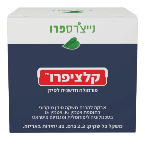 קלציפרו אבקת סידן פורמולה חדשנית לסידן סידן מיקרוני בתוספת ויטמין K2 ויטמין D3 בטכנולוגיה ליפוזומלית ומגנזיום ציטראט. מככיל 30 יח' באריזה מבית נייצ'רס פרו